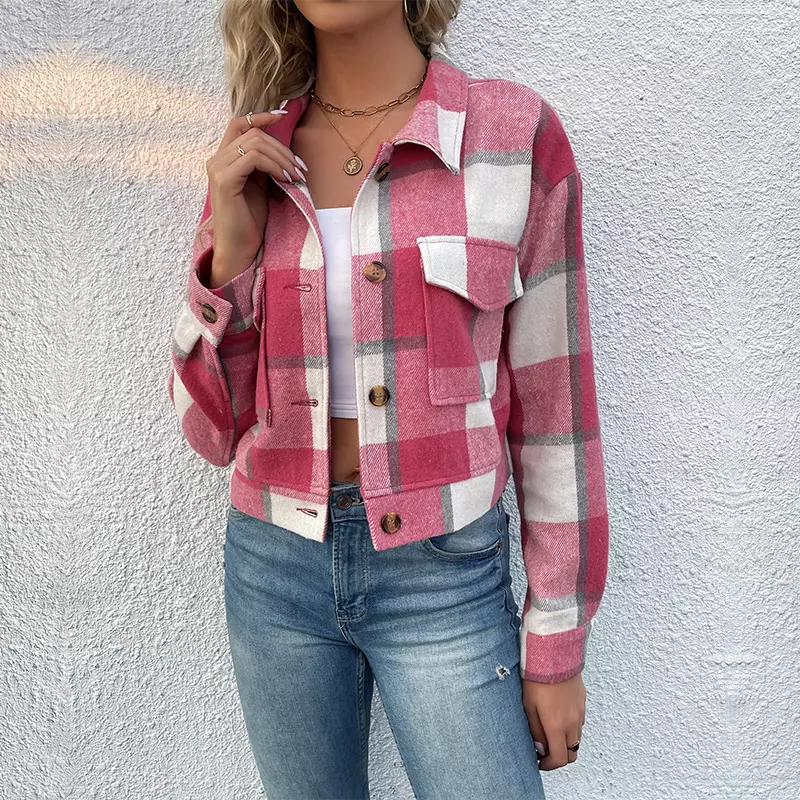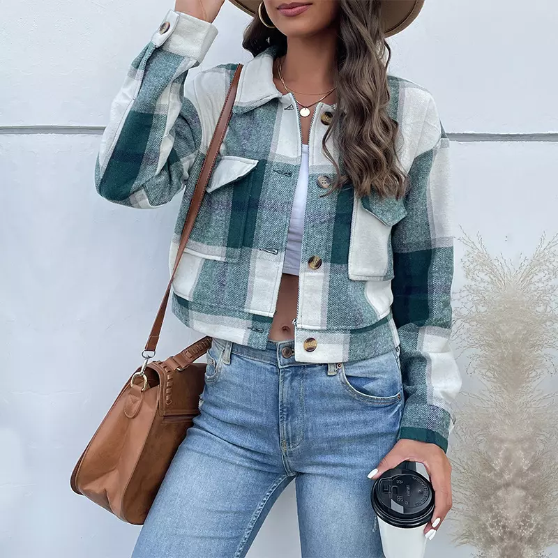 Rinnova il tuo look con questa giacca corta a quadri! Stile trendy, risvolti eleganti e tasche pratiche. Ideale per ogni occasione, disponibile in vari colori. Scegli il tuo preferito ora!